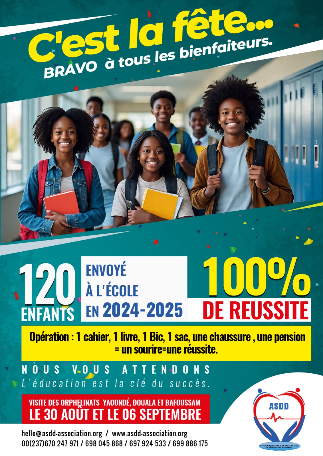 Le 30 aout et le 06 septembre, les orphelinats de Yaoundé. Douala et Bafoussam ont bénéficié une fois de plus de l’ASDD (Aide à la santé et au Développement Durable) qui ont fournir des fournitures scolaires aux enfants de ces orphelinats pour les aider à poursuivre leurs études dans de bonnes conditions.
